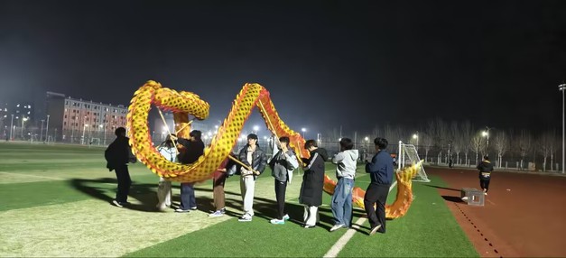 活动第一部分聚焦于“龙腾虎跃”的视觉盛宴。,随着夜幕降临,两条色彩斑斓的“巨龙”在激昂的锣鼓声中猛然苏醒。舞龙队员们身着统一服装,步伐矫健,手中的龙身随着节奏上下翻飞。现场重点展示了“二龙戏珠”“蟠龙闹海”等经典套路,时而盘旋升腾,似欲冲破云霄;时而蜿蜒游走,如在云海中穿梭。金色的龙头在灯光下熠熠生辉,龙须飘动,龙眼炯炯有神,仿佛被赋予了生命,学员们被这磅礴的气势深深吸引。